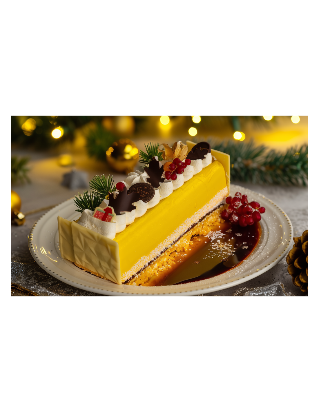 Biscuit moelleux coco, compotée mangue passion et mousse légère noix de coco.