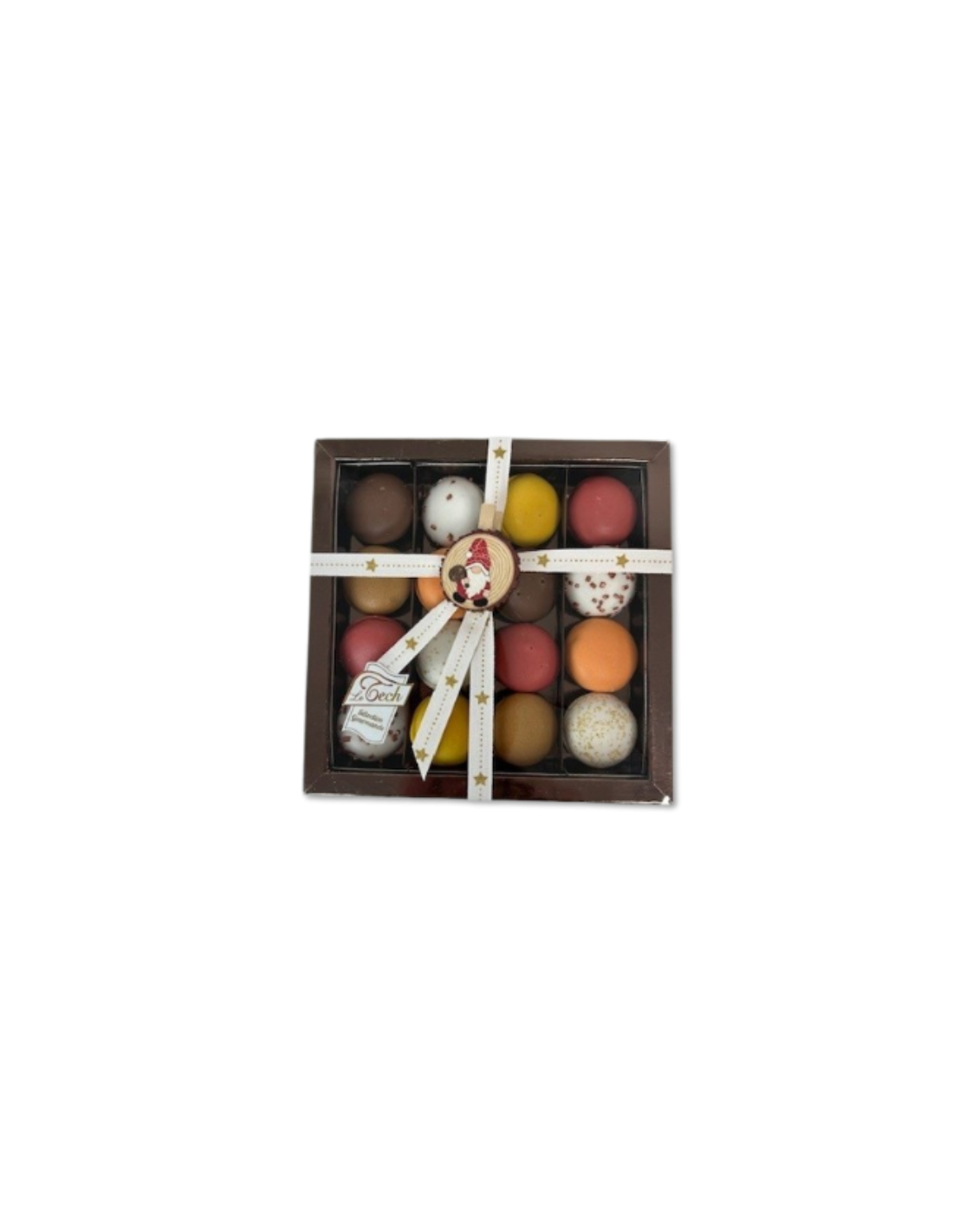 Ingrédients : sucre glace amylacé (sucre, amidon de maïs), chocolats LAIT, blanc, noir et NOISETTES gianduja (sucre, NOISETTES, beurre de cacao, poudre de LAIT entier, pâte de cacao, émulsifiant : lécithine de SOJA , arôme naturel de vanille), AMANDES tor