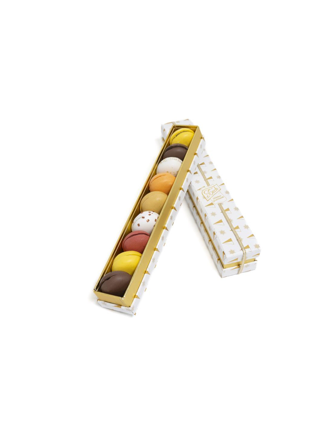 Version chocolatée du Macaron, alliant délicieusement fondant du gianduja et croquant d'une coque en glace royale. Craquez pour cette boite contenant un assortiement gourmand de macaronias (chocolat, crème de marron, citron, framboise, crème brûlée, fleur de sel, noisettes, orange)