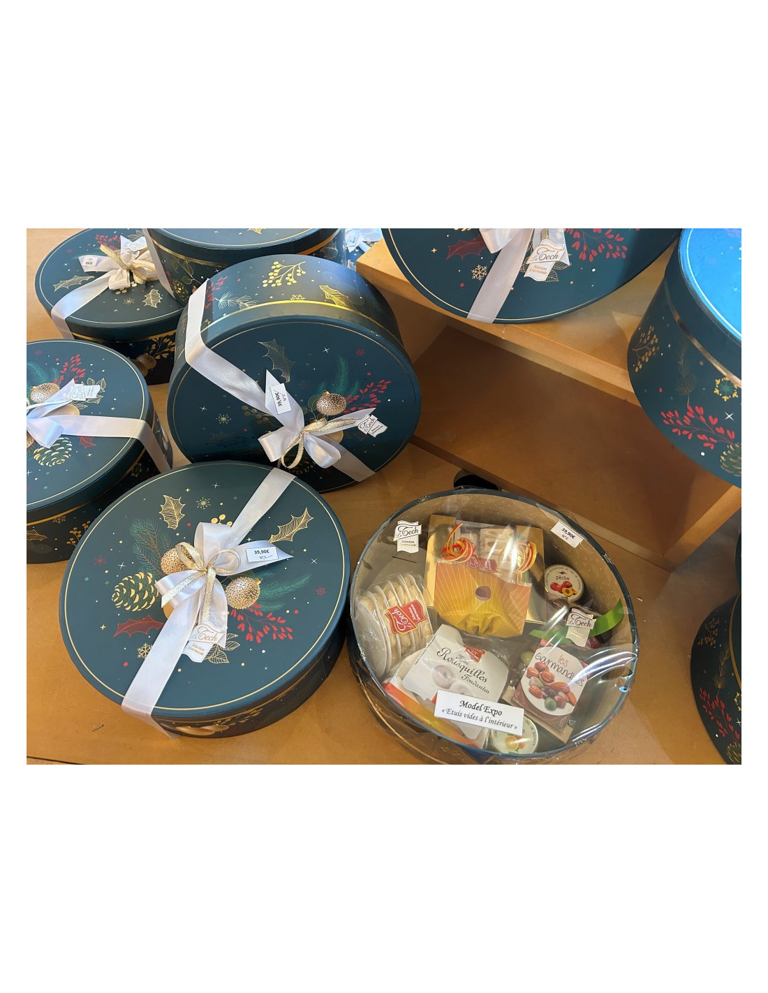 Boite chapeau composée de : 1 sachet mini rousquilles 150g 1 sachet mini tortas 150g 1 sachet passe temps ( amandes noisettes) 200g 1 étui nougat vanille 220g 2 mini pot de confiture