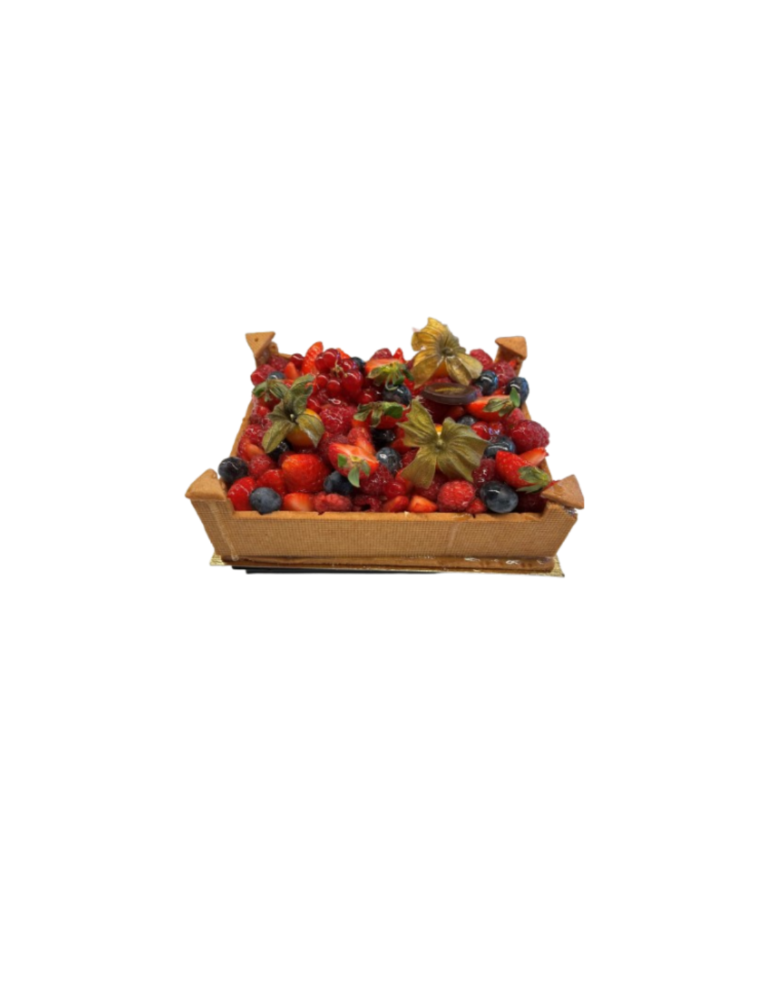 Cagette de fruit : Pâte sucrée, crème légère, biscuit nature et assortiment de fruit frais