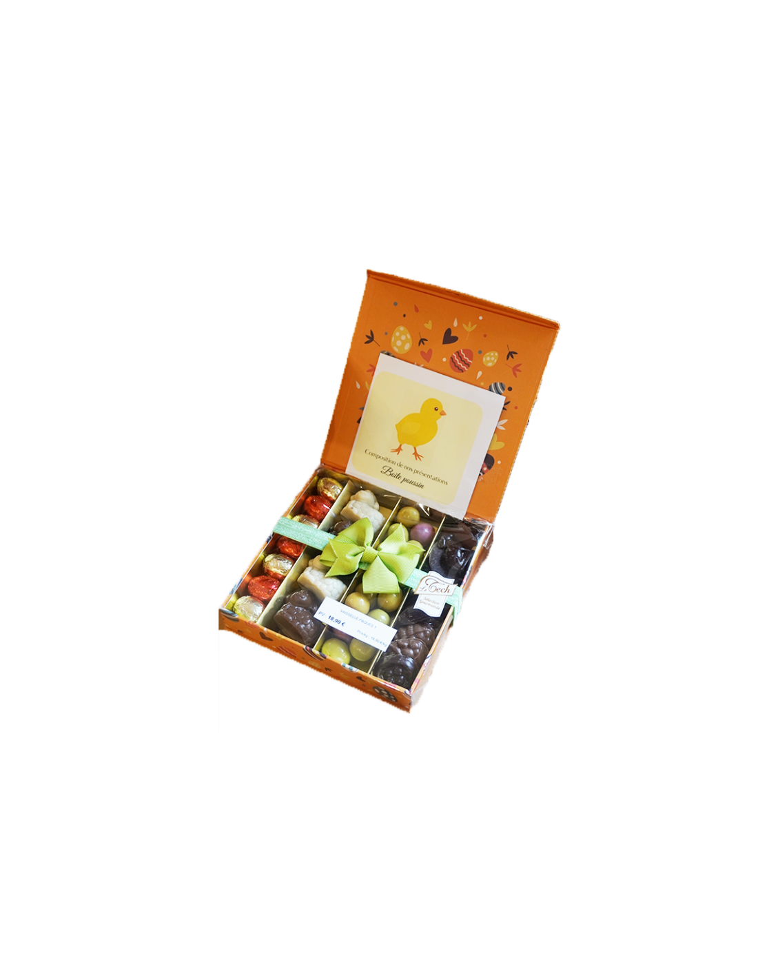 Assortiment d'oeufs praliné lait et noir sous alu, fritures en chocolat lait et noir, d'oeuf feuilleté praliné de chocolat noir et de chocolat blanc aux nuances pastel et de moutons de chocolat fourrés au praliné