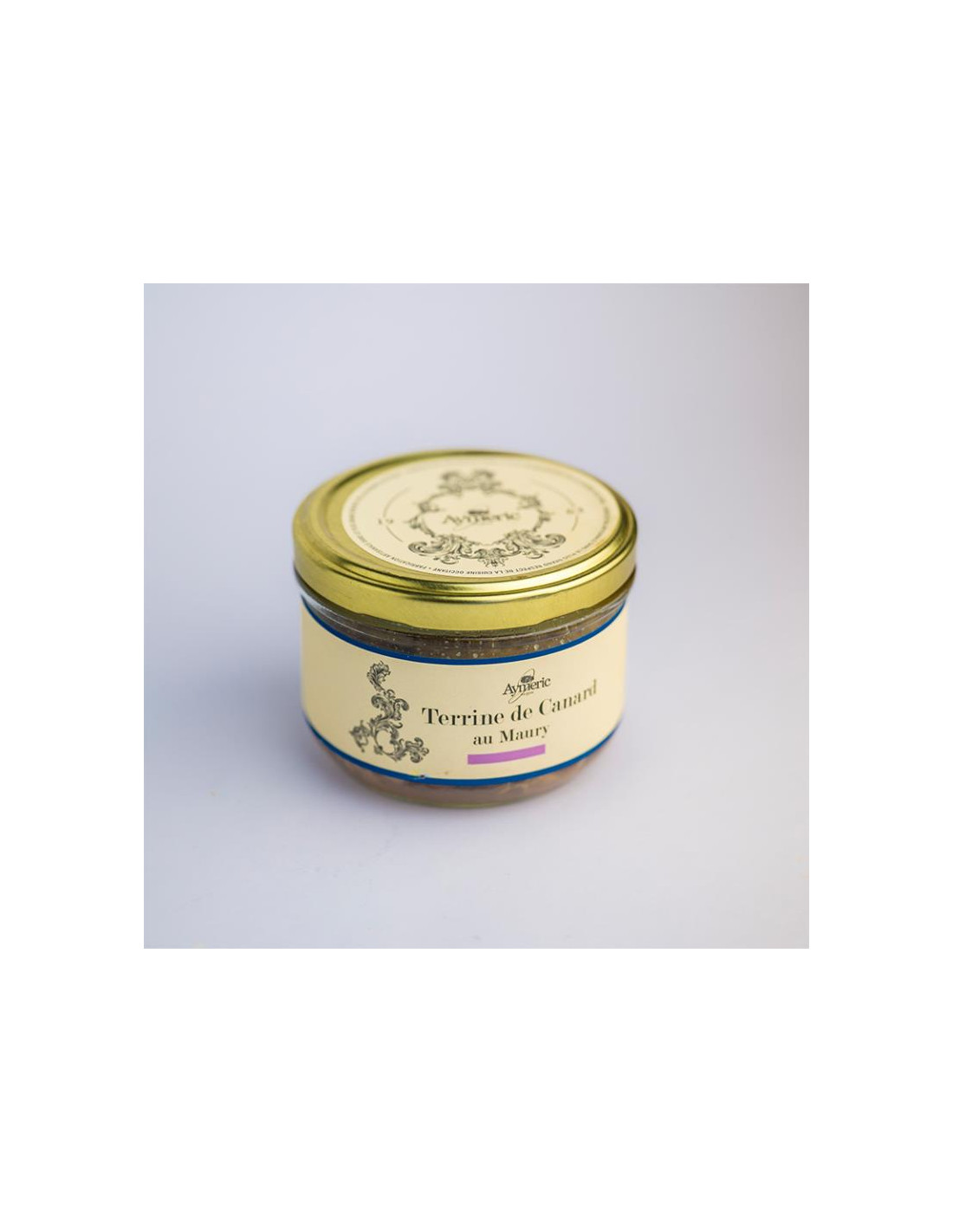 Une terrine au canard et au Maury. Le Maury est un vin d’appellation d’origine contrôlée produit autour de Maury, au nord-ouest de Perpignan dans les Pyrénées-Orientales. Son association avec le canard permet un parfait équilibre des saveurs. Poids: 190g